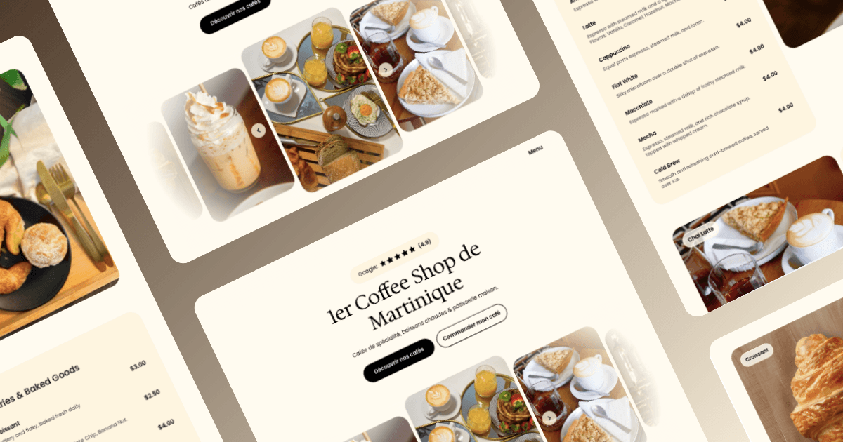 Création d'une maquette pour ce Coffee Shop. Le menu est visible immédiatement pour que le client se projete dans l'expérience : imaginer son café, son croissant et se voir déjà profiter du moment.